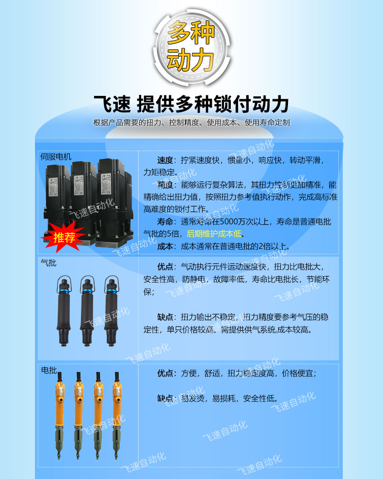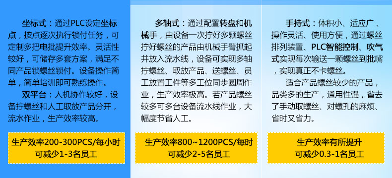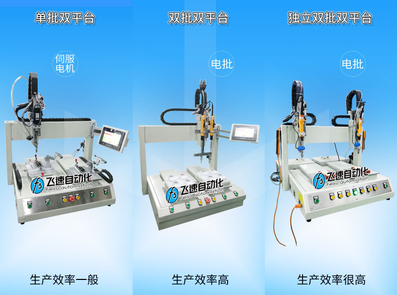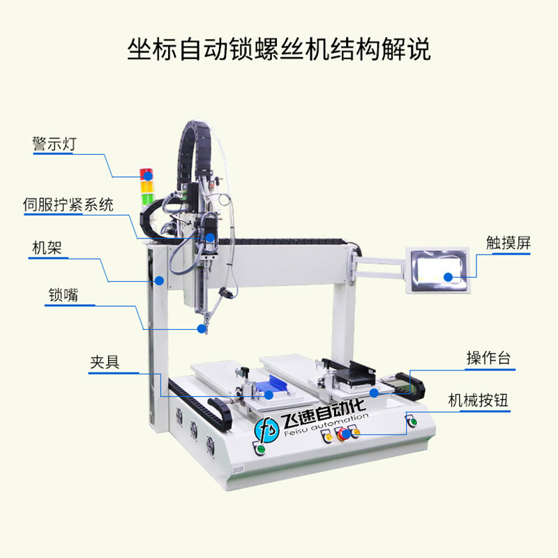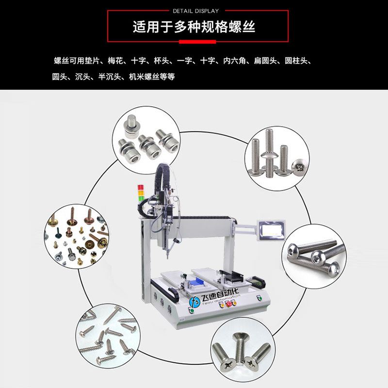 - 產品簡介: 雙平臺坐標式螺絲機取螺上螺系統(tǒng)可同時進行取螺、上螺,并自動完成鎖緊動作,自動化程度高,定位效果精度高,使用簡單、方便、快捷,大幅度提高生產效率。 飛速自動化根據(jù)驅動器產品結構進行設計了一臺雙平臺坐標是自動擰螺絲機,驅動器需兩部分鎖付,其采用柔性化設計,并適合對同一產品不同型號的加工工件進行自動打螺絲,設備由PLC控制鎖付工路徑,各個工位實現(xiàn)單獨加工,配置觸屏器,控制器界面實時顯示擰緊過程的主要數(shù)據(jù):扭力實際值、過程時間、是否合格等;由觸摸屏幕顯示、設置,設備還可以實時檢測轉速、控制軟啟動、控制轉角,篩選滑牙、假鎖等錯誤功能。 雙平臺坐標式螺絲機取螺上螺系統(tǒng)可同時進行取螺、上螺,并自動完成鎖緊動作,自動化程度高,定位效果精度高,使用簡單、方便、快捷,大幅度提高生產效率。